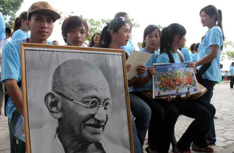 ៦-ក្រុមការងារដើម្បីសន្តិភាពលើករូបថតថ្នាក់ដឹកនាំឥណ្ឌា គឺលោក មហាត្មៈគន្ធី។