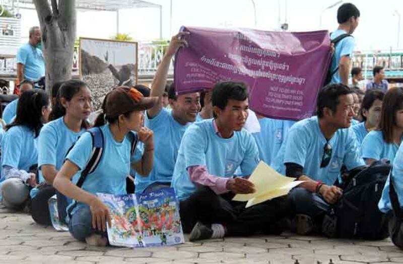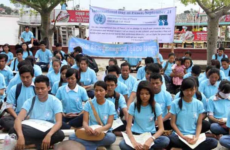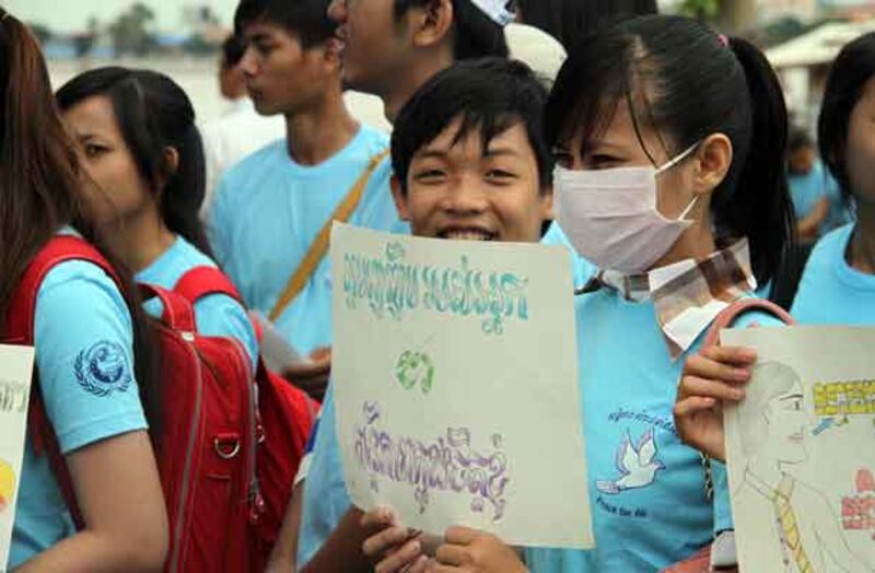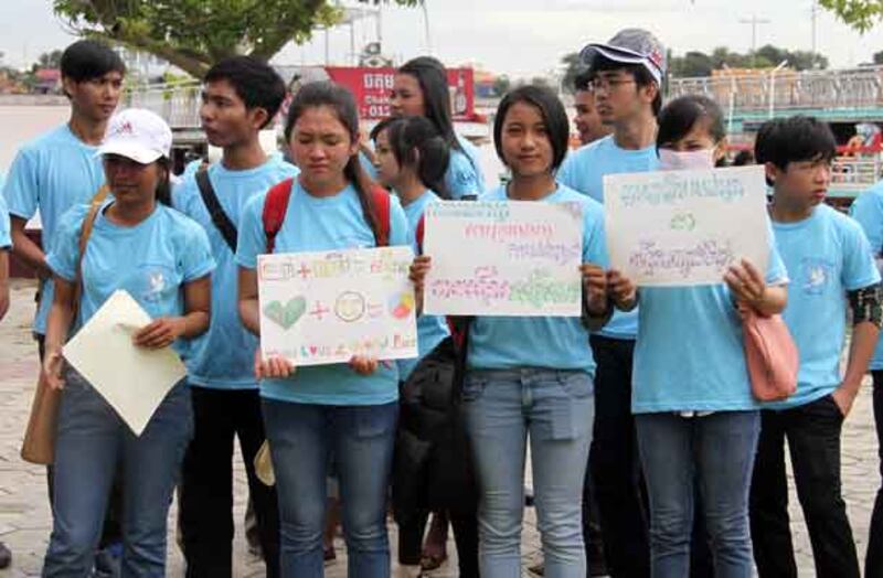 ៥-យុវជនលើកបដាស្ដីពីសន្តិភាព ក្នុងទឹកមុខញញឹម។