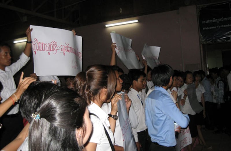 ៣-និស្សិតលើកបដាថ្កោលទោស លោក សុរិយា ស៊ូប៊ែឌី បន្ទាប់ពីលោកបញ្ចប់ការធ្វើបទបាឋកថារបស់លោក នៅល្ងាចថ្ងៃទី២១ ឧសភា ឆ្នាំ២០១៣។