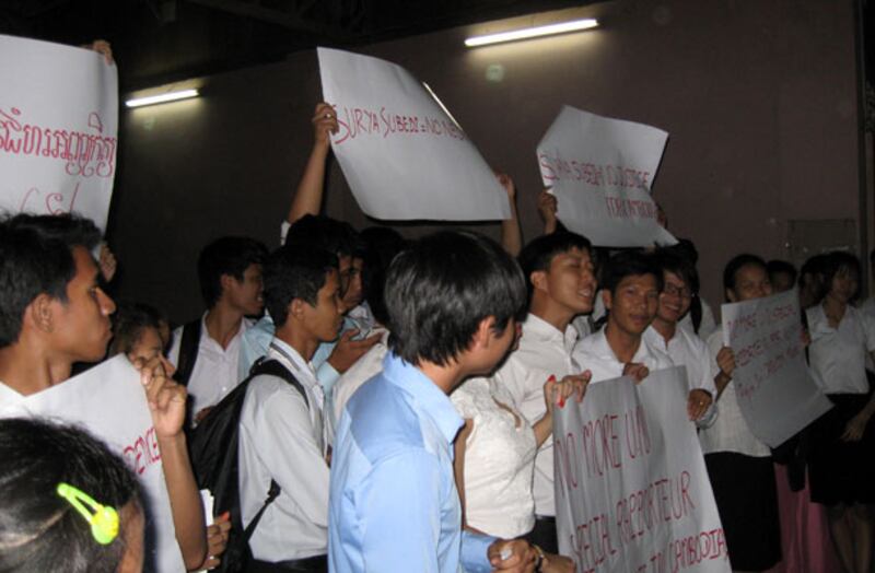 ៧-និស្សិតលើកបដាថ្កោលទោស លោក សុរិយា ស៊ូប៊ែឌី បន្ទាប់ពីលោកបញ្ចប់ការធ្វើបទបាឋកថារបស់លោក នៅល្ងាចថ្ងៃទី២១ ឧសភា ឆ្នាំ២០១៣។