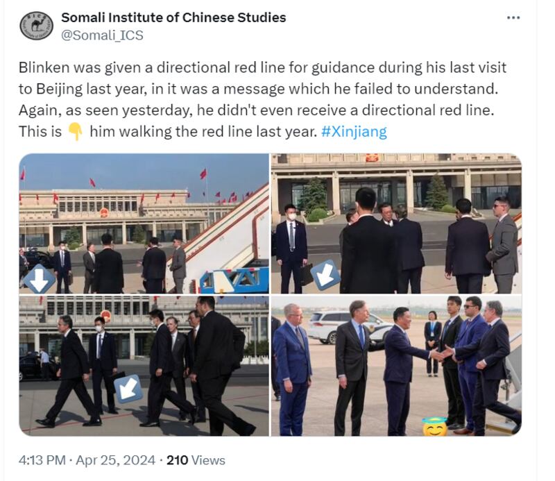 The Somali Institute of Chinese Studies claimed on X on April 26 that China had deliberately omitted a "guiding red line" when the secretary disembarked off his plane at Shanghai in order to signal displeasure.