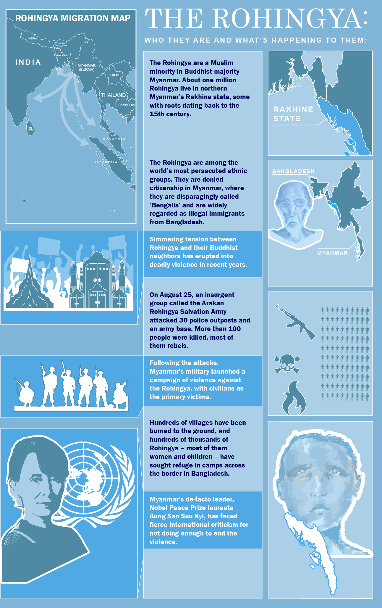 Army-led security operations have left more than 1,000 dead according to U.N. figures and sent more than 500,000 people”—roughly half the Rohingya population in Rakhine state”—fleeing into neighboring Bangladesh, triggering an international humanitarian crisis.