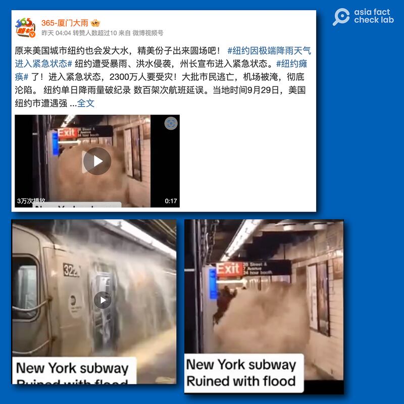 为了近一步查证,亚洲事实查核实验室将两段画面截图进行反搜,找到2021年9月台湾《自由时报》的 报道,题为"飓风艾达在美国东部酿数十死 洪水灌入地铁站画面曝光",根据报道引用的Instagram帐号"subwaycreatures"原始贴文,视频发布时间是2021年9月2日艾达飓风袭击之时,且在同一则贴文中,也找到了洪水如瀑布冲击列车的画面。上述影像也获 BBC中文网引用。