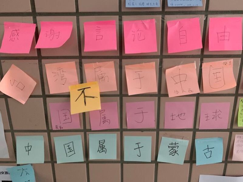 台湾政大综合大楼口“撑香港、反送中”的连侬墙占据了整整两大墙面。包括政大学生会和港生、台生,贴满各式各样声援香港的标语和贴文。不过,在墙的另一面,出现一些以简体字书写的贴文“反对污名香港警察,保障港警合法权益”等撑港警的标语。而这些标语又被许多“挺香港”、“民主是个好东西”等贴文覆盖。在这一区最顶上,有人用繁体字写上了“新中国言论自由改革示范区”的标题,路过的人很容易以为这是“陆生连侬墙”。