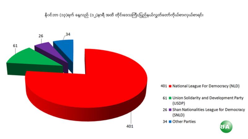 နိုဝင်ဘာလ ၁၃ ရက် နေ့လည် ၁၂ နာရီအထိ ပြည်ထောင်စု ရွေးကောက်ပွဲ ကော်မရှင်ရဲ့ ထုတ်ပြန်ချက်အရ ပြည်သူ့ လွှတ်တော်အတွက် အမျိုးသားဒီမိုကရေစီ အဖွဲ့ချုပ် ၂၃၈ ဦး ၊ အမျိုးသားလွှတ်တော် အတွက် ၁၁၀ ဦး ၊ တိုင်းဒေသကြီး နဲ့ ပြည်နယ်အတွက် ၄၀၁ ဦး ရှိနေပါတယ်။