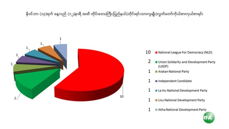 တိုင်းဒေသကြီးနဲ့ ပြည်နယ် ( တိုင်းရင်းသားလူမျိုး ) လွှတ်တော်ကိုယ်စားလှယ်အတွက် အမျိုးသားဒီမိုကရေစီအဖွဲ့ချုပ် ၁ဝ ဦး၊ ပြည်ထောင်စုကြံ့ခိုင်ရေးနဲ့ ဖွံ့ဖြိုးရေးပါတီ ၂ ဦး၊ ရခိုင်အမျိုးသားပါတီ ၁ ဦး၊ တစ်သီးပုဂ္ဂလ ၁ ဦး၊ လီဆူအမျိုးသားဖွံ့ဖြိုး တိုးတက်ရေးပါတီ ( ဒူးလေးပါတီ ) ၁ ဦး၊ လားဟူအမျိုးသားဖွံ့ဖြိုးတိုးတက်ရေးပါတီ ၁ ဦး၊ အာခါအမျိုးသားဖွံ့ဖြိုးတိုး တက်ရေးပါတီ ၁ ဦး တို့ဖြစ်ပါသည်။