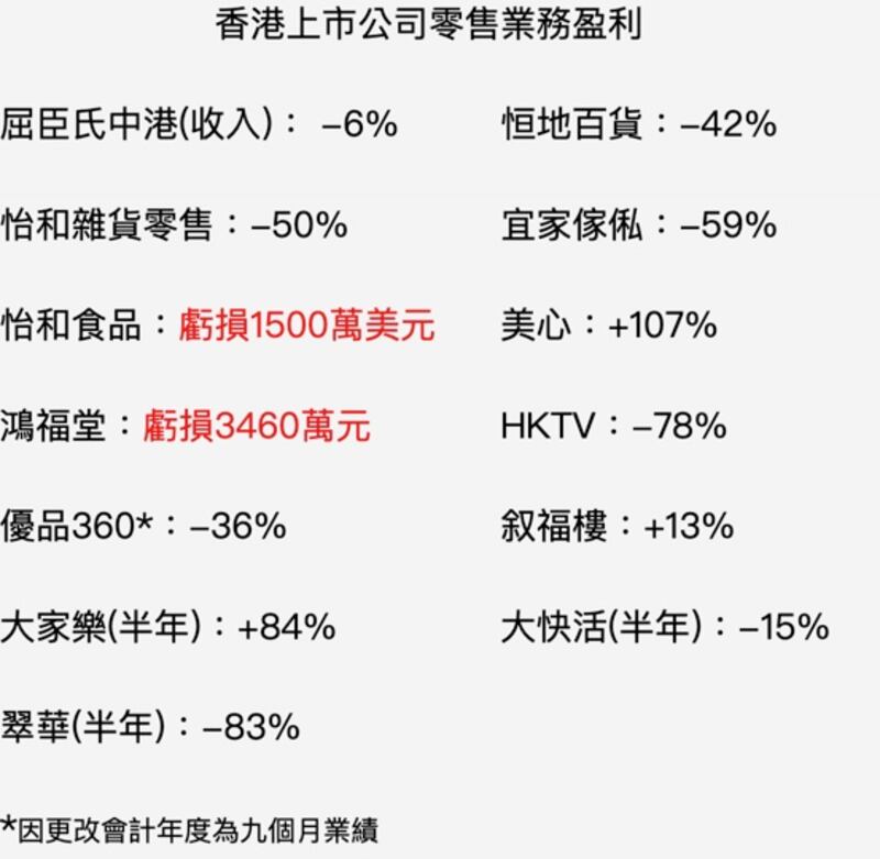 而另一傳統英資機構怡和的百貨部門利潤去年減少了一半;他們經營著香港最大連鎖超市惠康、健康與美容零售商萬寧。怡和表明由於港人北上消費成風,尤其是在周末,嚴重損害了集團生意。至於集團另一分支,在香港經營的宜家傢俬(IKEA),去年盈利更大跌六成,原因則是疫情期間港人購物習慣改變,以及樓市疲弱影響了需求。