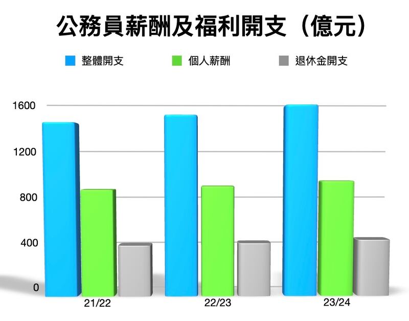 翻查上年度、即2023至24年度逾17萬公務員薪酬及有關的開支總額達1,570億元,按年增長6%,佔政府經常開支近26%,較上一個年度大增4.37個百分點。同時,立法會議員亦在十月起加薪1.8%,本財政年度截至11月底,議員酬金開支約7,500萬元。