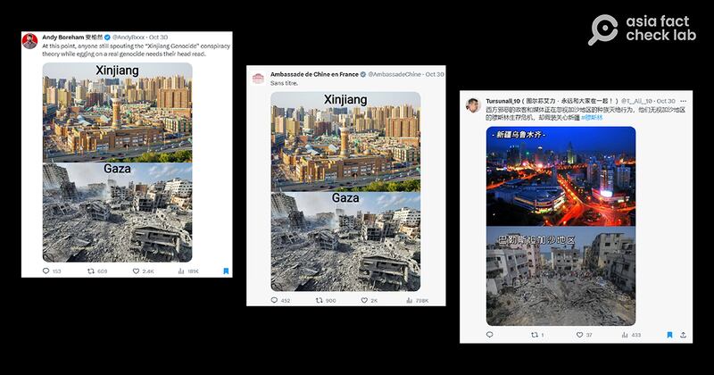 約一周後, 中國駐法國大使館、任職於《上海日報》的新西蘭人 安柏然(Andy Boreham),以及網紅 圖爾蓀艾力的X帳號上接連出現同樣主題的貼文。中國駐法國大使館的發文沒有文字解釋,而安柏然則指責西方社會忽視加沙的種族滅絕,並稱所謂「新疆維族面臨種族滅絕」的說法,是西方社會抹黑中國的陰謀論。這張圖以上下對照繁榮的新疆和殘破的加沙,成為日後在X上流傳廣泛的版本。