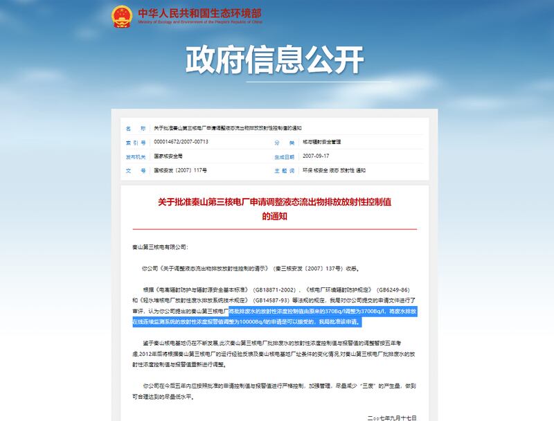 原國家環保總局於2007年還曾 公告,批准濱海核電站秦山第三核電站批排廢水的放射性濃度控制值由原來的每公升370貝克放寬為每公升3700貝克,也批准廢水排放在線連續監測系統的放射性濃度報警值調整為每公升10000貝克。