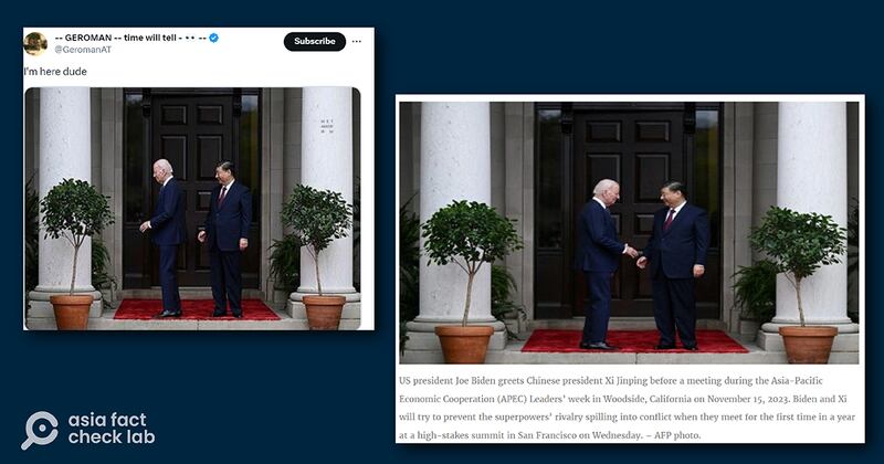 亞洲事實查核實驗室以Google搜尋圖片後發現,這張圖在X平台、Telegram、Reddit等平台瘋傳。同時找到 法新社(AFP)刊登了一張相似的照片。比對兩張照片中習近平的西裝摺痕,包括肩線、手肘、左腿;以及皮鞋的反光亮點,均高度相似。但法新社的照片上,拜登是面對著習近平,兩人呈現自然的握手姿勢。