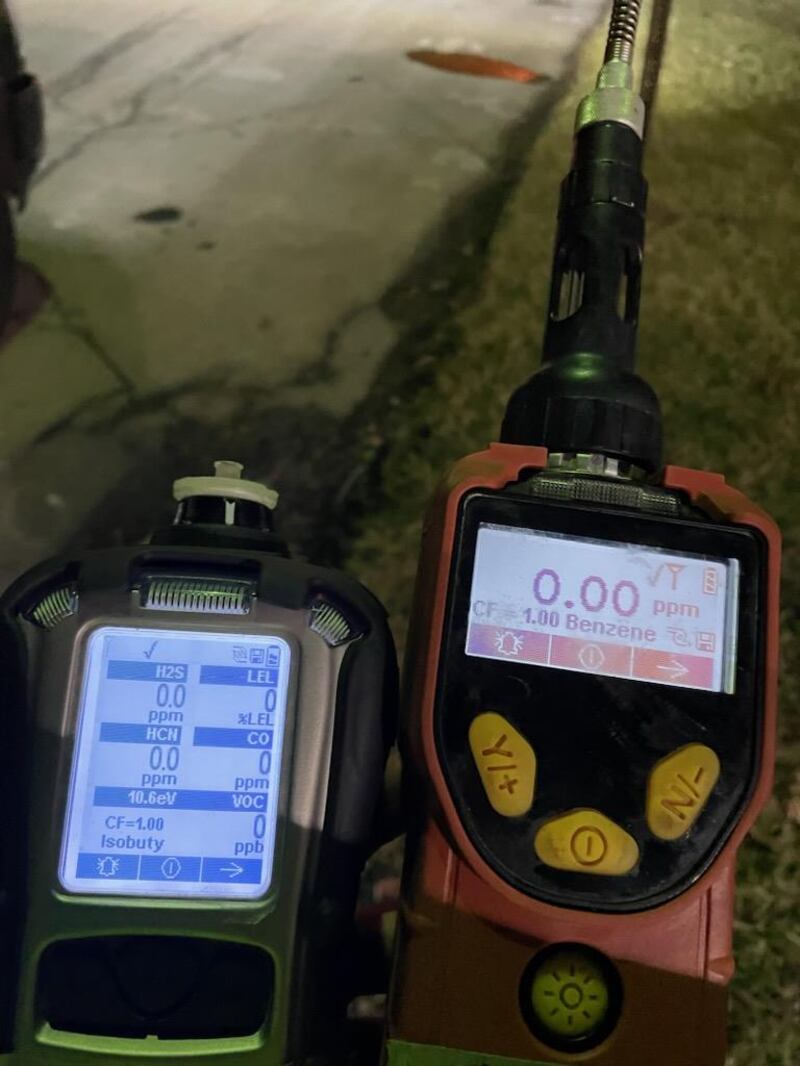 美國環保局在事故現場的便攜式空氣污染物檢測儀器,多項污染物未達到檢出限,顯示為0。(EPA)