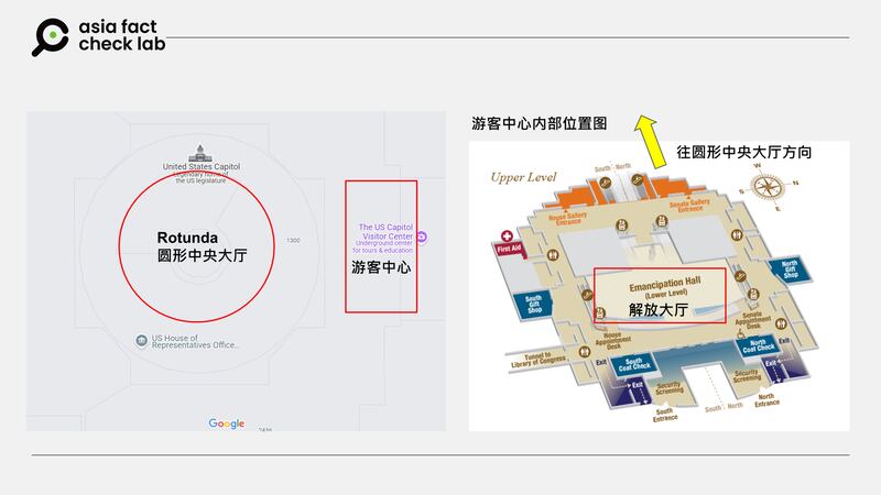 關於舉行宣誓就職典禮的圓形中央大廳與遊客中心的相對位置,AFCL根據CVC官網上的地圖與Google地圖綜合整理後製如下所示。