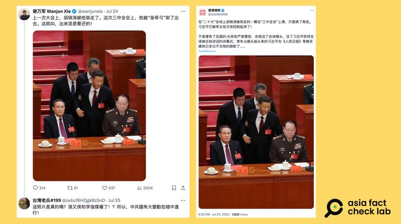 在社媒平台X上,獲認證的藍勾勾用戶「 謝萬軍」、「德潤傳媒」等帳號近日發文,稱中國國家主席習近平在三中全會上「被架走了」,並附上一張圖片,畫面中間的是站著的習近平,身旁有兩名黑衣男子攙扶,而在習近平面前坐著的,是國務院總理李強、中央軍委副主席張又俠。