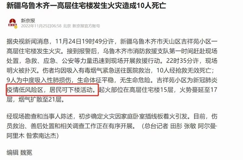 中國「動態清零」政策下人道災難頻發,已被封城逾百天的烏魯木齊再釀慘案,一高層住宅起火時因封控致居民無法及時逃生。民間傳出的死亡數量遠遠高於官方通報的10人。海外維吾爾人譴責當局「借疫殺人」。