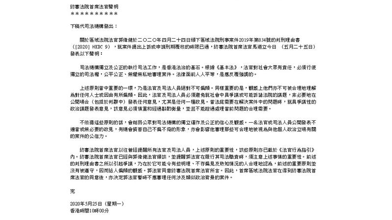 在香港,對於區域法院法官郭偉健在處理將軍澳「連儂牆」斬人案時,在判刑中稱讚親建制被告願意承擔罪責有「高尚情操」一事,終審法院首席法官馬道立周一(25日)罕見發表聲明,馬指已對郭作出提醒,不應在公開場合,尤其於判詞中發表政見,並決定郭官暫時不應審理任何涉及類似政治背景的案件。有法律界人士認為馬道立做法合理,可釋除公眾疑慮。(黃樂濤 報道)