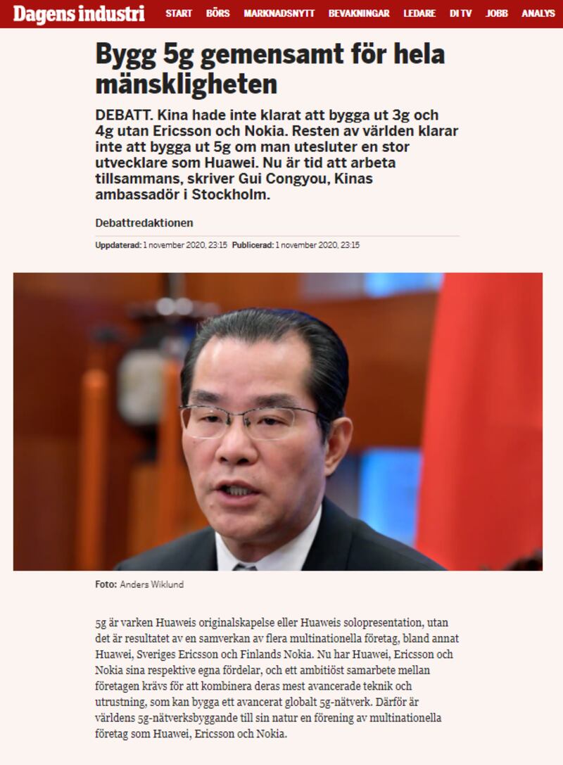 據本台查閱,去年11月1日,中國駐瑞典大使桂從友曾在《今日工業報》上發表《合作5G造福全人類》的署名文章,其論點與該報周一的社論頗有諳合之處。
