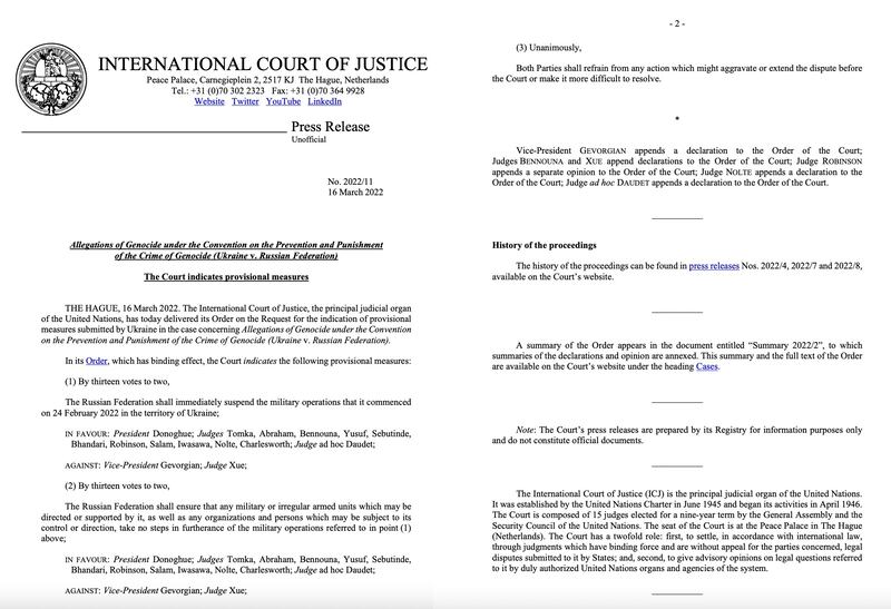 總部位於海牙的國際法院(ICJ)周三對烏克蘭提交的緊急訴訟作出三項裁決,包括要求俄羅斯立即停止從2月24日起對烏克蘭的入侵行動;確保任何可能受俄羅斯指揮或支持的軍事或非正規武裝部隊等,不再繼續推動軍事行動;以及俄烏雙方應避免採取任何可能加劇或延長訴訟爭議的行動。