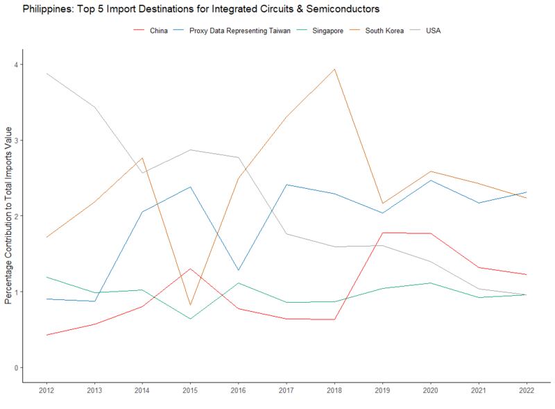 製造業中,集成電路和半導體零件進出口錄得最顯著的增幅。2022年的貿易數據顯示美國和其盟友,包括︰台灣﹑南韓和日本包攬超過一半的入口額度;而菲律賓電子產品頭三名出口目的地為香港﹑中國和新加坡。