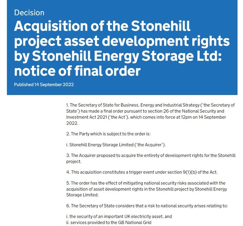 英國商業、能源及產業策略部的聲明表示,這項收購案關乎英國重要電力資產,認為收購案可以繼續進行,但必須遵從上述限制,包括不得和中方分享敏感資訊,及限制中方股東對企業重要員工的任命權,以減輕英國國安風險。「部長認為這項最終命令,是有必要而且相稱的措施,以減輕國家安全風險。」
