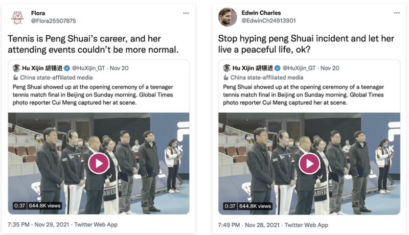 對許多其他推特用戶來說,這些評論顯得很不自然。11月才加入推特的一個名為「Flora25507875」的疑似機械人帳號寫道:「網球是彭帥的職業,她參加活動再正常不過了。」該帳號已不再在線。