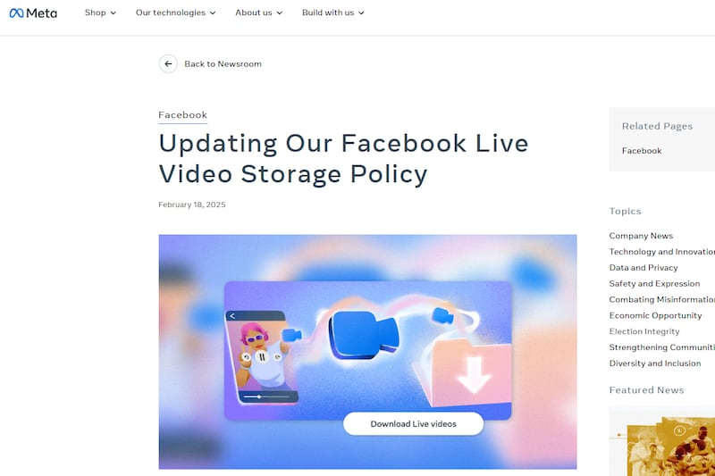 Facebook notified users last month that it will be deleting archived live video streams from June 5, while newly streamed live video will be deleted after 30 days from Feb. 19, 2025.