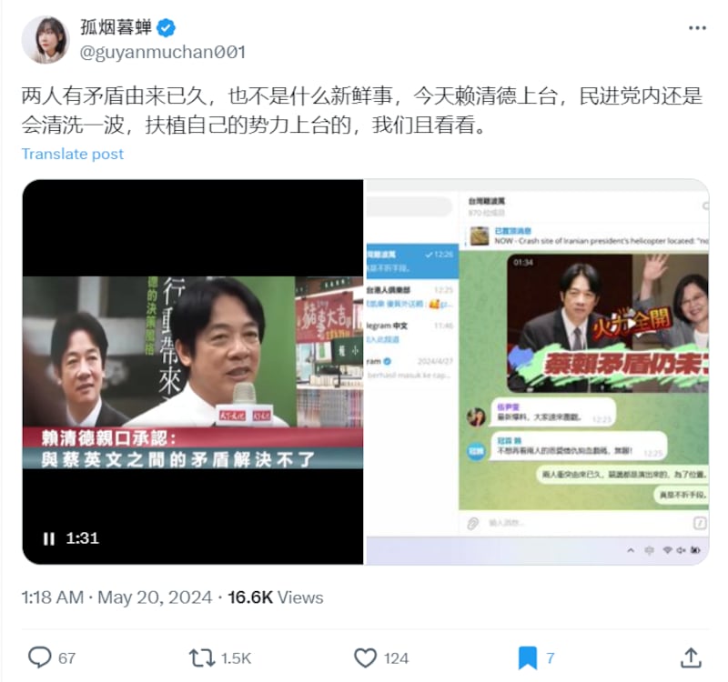 Following the inauguration of Taiwanese President Lai Ching-te on May 20, a claim emerged that Lai complained about his predecessor, Tsai Ing-wen, in a leaked audio.