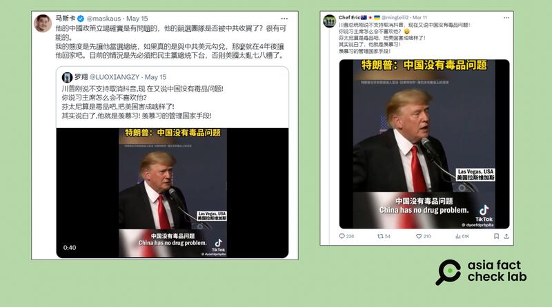 A claim emerged in Chinese-language social media posts that former U.S. President Donald Trump stated in a recent speech that China had no drug problem citing a video as evidence.