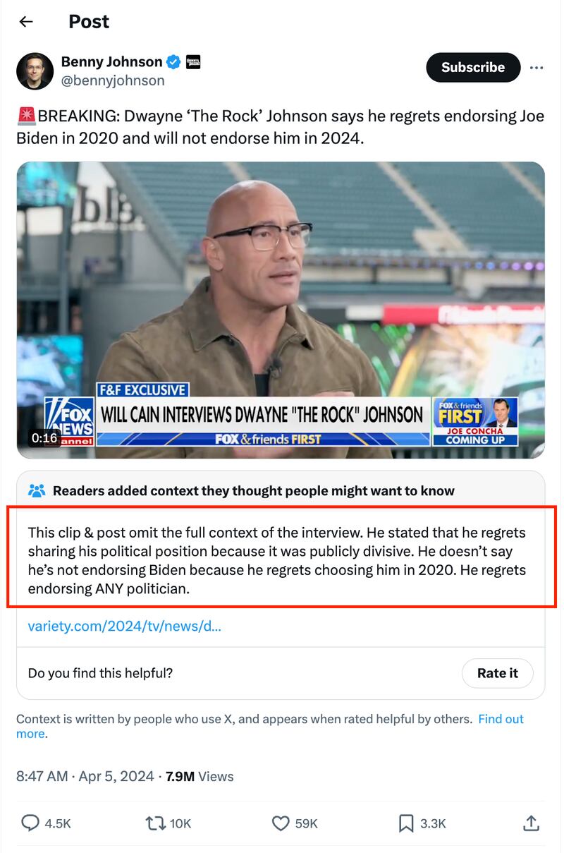 One account on X with over 500,000 followers posted a clip on April 6 taken from an interview Johnson conducted with Fox News earlier that month. The accompanying text stated that in addition to regretting his support of Biden in 2020, Johnson vowed he "won't make the same mistake in 2024."