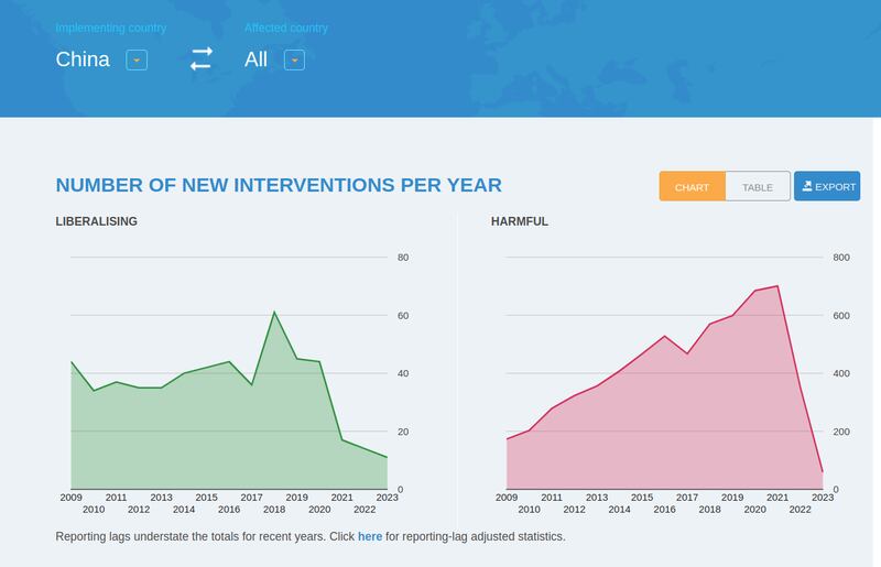 Beijing has implemented over 6,000 unilateral interventions that harm foreign commercial interests since 2009, while it has imposed more than 90 tariffs since 2021, according to Global Trade Alert, an independent initiative that monitors trade policy announcements from around the world.