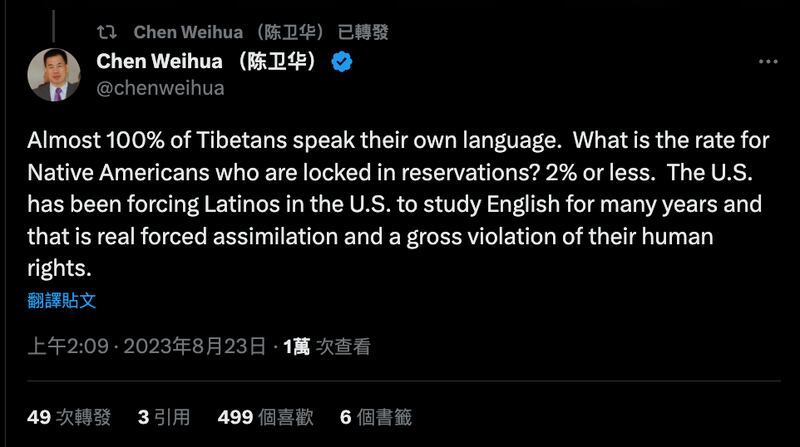 Chinese foreign ministry spokesperson Hua Chunying later posted similar claims on X that 96% of Tibetans can speak their ethnic language.