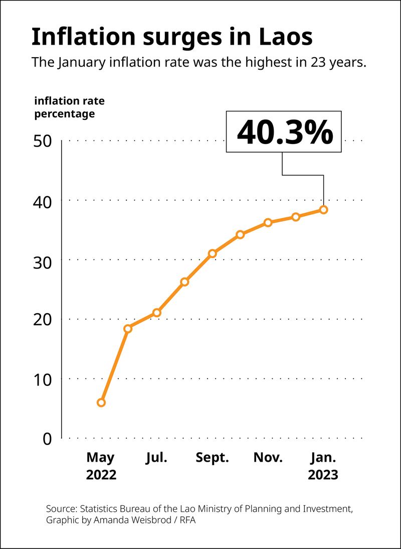 Inflation in Laos hit 40.3% in January, according to the country’s National Statistics Bureau, and even normally well-off state employees are feeling the squeeze.
