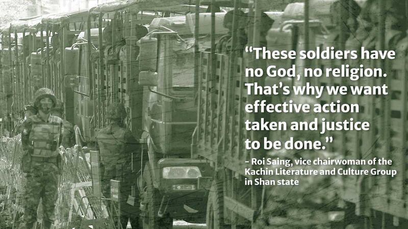 “At the age of 62, she was violated like this,” saidRoi Saing, vice chairwoman of the Kachin Literature and Culture Group in Shan state. “These soldiers have no God, no religion. That’s why we want effective action taken and justice to be done. If these crimes are not taken seriously, there cannot be any safety for any woman regardless of her age.”