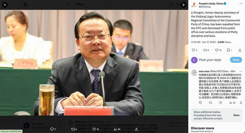 In a related development, Li Pengxin, a former deputy secretary of the Xinjiang Uyghur Autonomous Region, the region north of Tibet, has been expelled from the Communist Party and dismissed from public office for “serious violations of Party discipline and laws,” official Chinese media reported Monday.