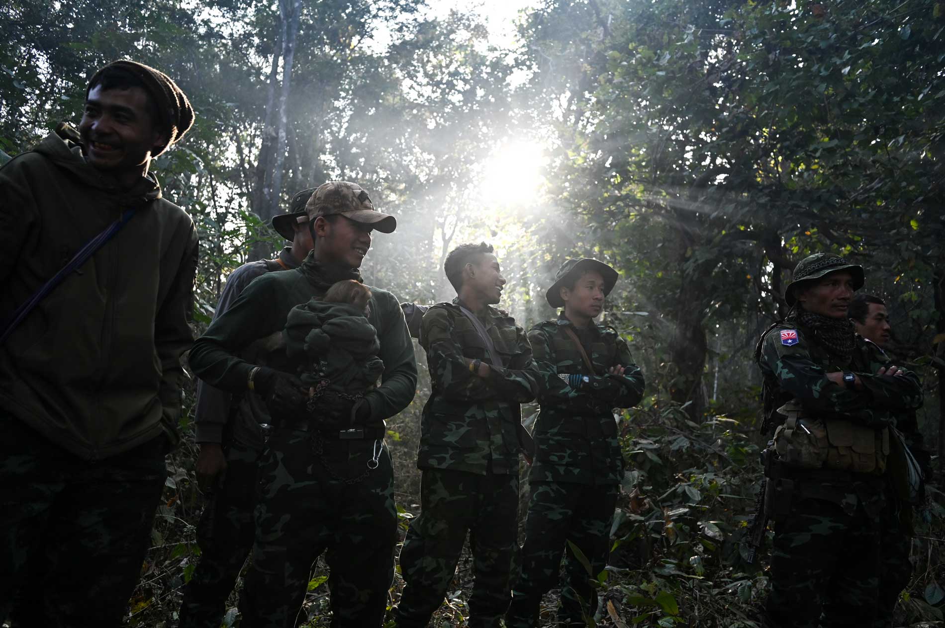 In these photos from February and March of this year, Khu Sam presents the front lines of a conflict that shows little sign of abating. Haggard families trudge past a rebel’s car as they escape yet another bombing; medics treat a gravely wounded soldier; fighters duck gunfire inside a temple. But the photographer also captures moments of humor and grace: young fighters smile as they splash in a river; a soldier cradles a pet monkey like a child.