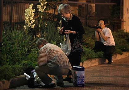 Ding Zilin, the co-founder of Tiananmen Mothers, center and her husband Jiang Jielian, at left, place offerings to commemorate the death anniversary of her son at the spot where he died during the 1989 crack down on pro-democracy protesters in Beijing in 2010. A plainclothes security officer films in the background as other police officers kept journalists and the public away. Ng Han Guan | AP