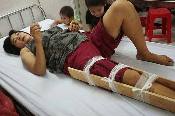 On yet another video posted on YouTube, Tran Thi Nga is wheeled to a hospital, an arm and a leg in bandages and splints, and swollen bruises on what remains exposed of her body. Two little children run behind her stretcher, and Tran Thi Nga comforts them as she speaks to the camera to document the attack.
