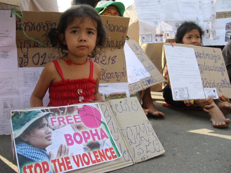 ២. កុមារីម្នាក់កាន់បដាសរសេរថា ដោះលែង យ៉ោម បុប្ផា នៅពេលដែលម្ដាយរបស់ពួកគេតវ៉ានៅសាលារាជធានីភ្នំពេញ។ ដោយ មុំ សុផុន
