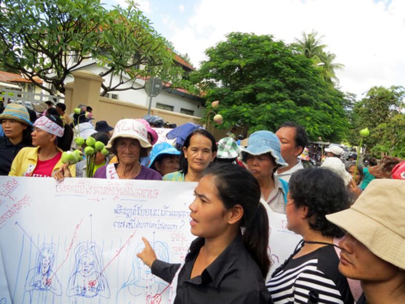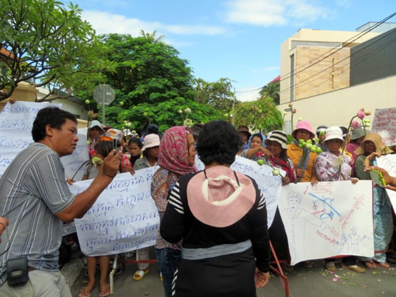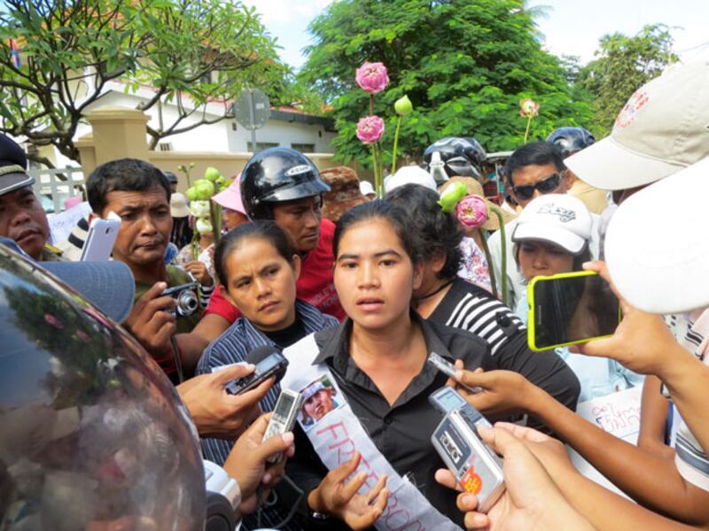 តំណាងអ្នកបឹងកក់ លោកស្រី ទេព វន្នី ផ្ដល់បទសម្ភាសន៍ដល់អ្នកកាសែត នៅក្បែរការិយាល័យសហភាពអឺរ៉ុប នាវិមានឯករាជ្យ។