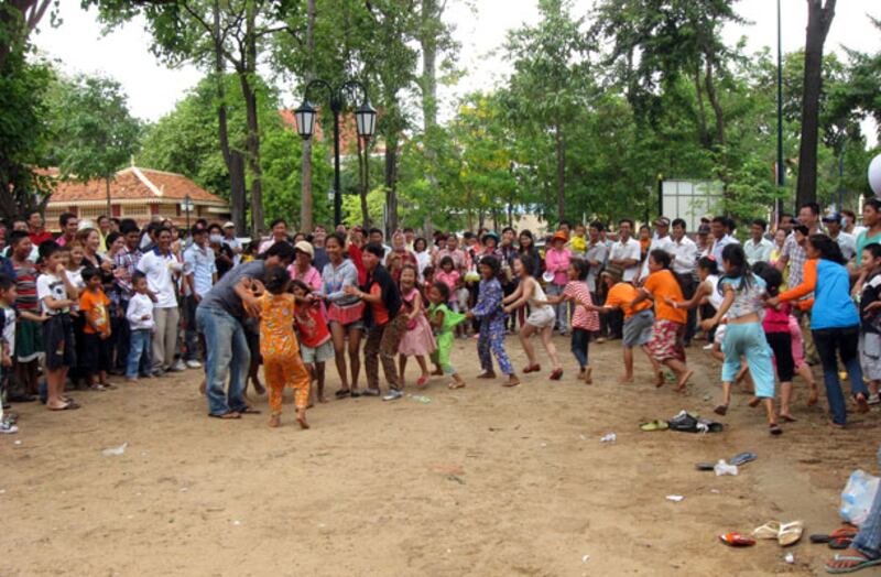 ៨យុវជននិងកុមារនាំគ្នាលេងល្បែងខ្លែងចាប់កូនមាន់ នៅរមណីយដ្ឋានវត្តភ្នំ។
