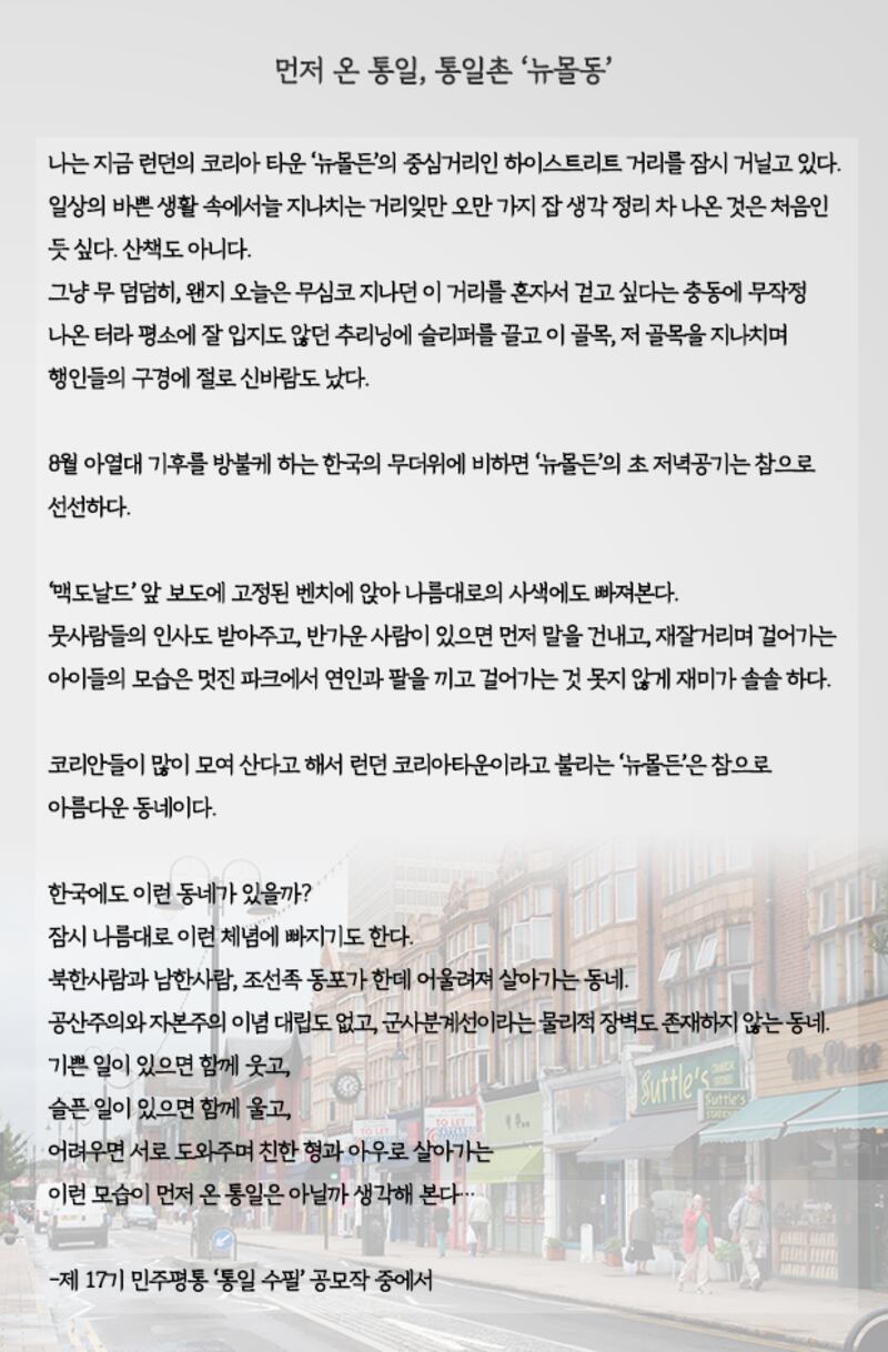 [김주일] 일단 영국에는 탈북민 그리고 한인분들, 조선족분들 한민족이 뉴몰든이라는 코리안타운에 모여서 살고 있어요. 그래서 저희가 소위 애정을 가지고 이야기한다고 하면, 남북한 주민들이 함께 모여 사는 동네, ‘통일촌 뉴몰동’이라고, 여기 지역이 뉴몰든인데 우리가 애정을 가지고 한국의 동네처럼 ‘동’ 자를 붙여가지고 뉴몰동이라고 부르고 있거든요. 그래서 우리가 한반도를 지지하고 있는 입장에서는 한 번도 경험해보지 못한 통일사회, 남북한 주민들이 모여 사는 사회가 바로 이 통일촌 뉴몰동이 아닌가 그런 생각을 하고 있습니다.