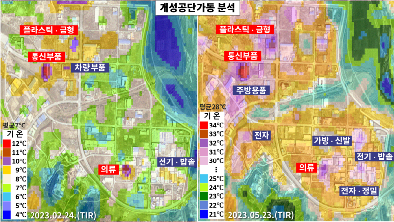 [정성학] 랜셋 위성이 촬영한 5번의 열적외선 영상을 분석한 내용에 따르면 북한은 올해 플라스틱과 금형, 스마트폰 부품과 여성 의류 시설 등을 일 년 내내 활발히 가동했습니다. 또 가방과 신발 공장은 올봄부터 꾸준히 생산 활동을 보였고요, 차량 부품과 전기∙밥솥, 전자 제품을 생산하는 공장도 계속 가동해 온 것으로 나타났습니다. 이를 통해 북한이 개성공단에서 생산한 주력 상품이 무엇인지를 엿볼 수 있는데요. 우선 지난 2월 24일과 5월 23일에 촬영한 열적외선 영상을 비교해 보면, 플라스틱과 금형, 스마트폰 부품, 여성 의류 생산 시설은 유난히 붉은색을 띠고 있습니다. 붉은색은 공장이 고열을 발산하면서 활발히 가동되고 있다는 것을 뜻하고요. 보라색도 공장이 가동되고 있음을 의미하는데, 지난 2월에는 가동한 시설이 차량 부품과 전기∙밥솥 등에 그쳤다면, 5월에는 주방용품과 가방, 신발, 전자∙정밀 공장에서도 열을 내며 가동 중임을 알 수 있었습니다.