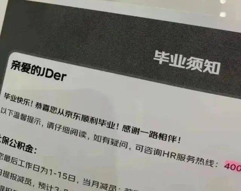 中国基金报援引网友的爆料称,京东的人事部门把裁员信称之为“毕业须知”,并在开头写道“毕业快乐,恭喜从京东顺利毕业”等字样。B站也将裁员的通知写成“毕业日”事项指引等等。
