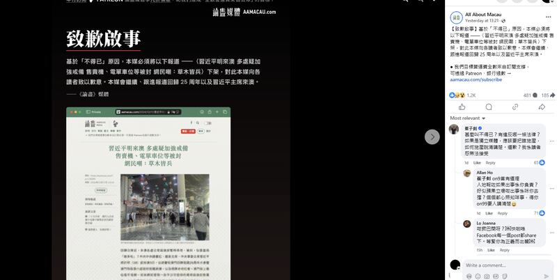 澳门网媒“论尽媒体”就在周二发布一则“致歉启事”,指基于“不得已”原因,必须把一篇报道下架,为此向读者致歉。报道题为“习近平明来澳 多处疑加强戒备 售卖机、电单车位等被封 网民嘲:草木皆兵”,声明更附上被打马赛克的报道截图,用另一种方式使报道“复活”。