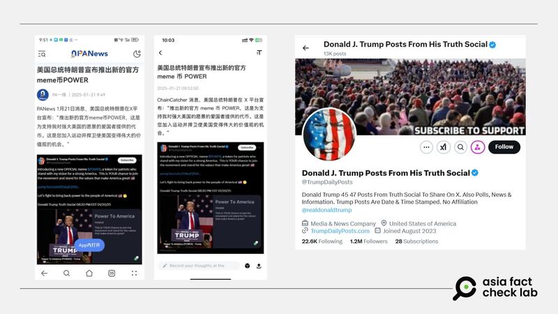 亚洲事实查核实验室(Asia Fact Check Lab, AFCL)注意到,在特朗普就职后,网上盛传特朗普又推出新的官方迷因币“$POWER”,并附上社媒或网媒报道截图为证。