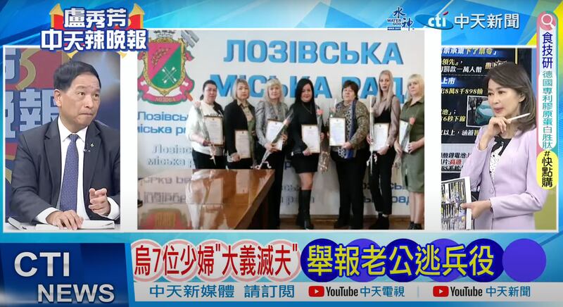4月2日,台湾中天新闻“辣晚报”的节目中,主持人卢秀芳展示了一张照片,7名据称是乌克兰人的妇女手持鲜花与证书,被说成是因为“大义灭夫”举报丈夫逃避征兵,获政府公开表彰。节目中,台湾空军前副司令张延廷更评论,举报者“都是大妈,他们的对象都是大叔”,意指乌克兰年轻兵源不足。