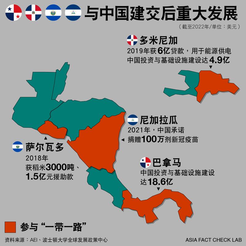 但亚洲事实查核实验室针对毛宁上述说法查核后发现,这些位于拉丁美洲或加勒比海地区国家与中国建交后,都获得了贷款或援助。