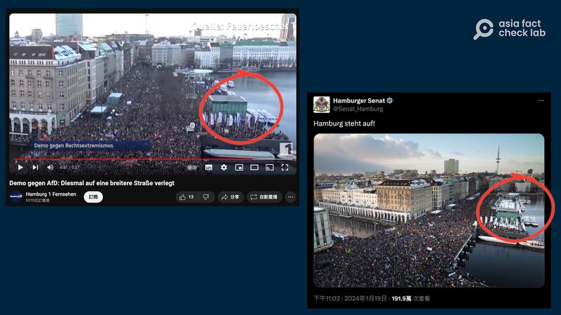 我们以关键字搜寻,找到了德国媒体"Hamburg 1 Fernsehen"针对汉堡反AfD的 报道,视频画面与微博流传影像一致。此外,汉堡参议院的X账号亦在1月19日贴出这次示威的 视频,画面也相符。