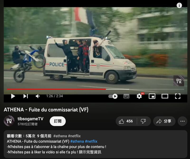 电影《雅典娜》 预告片1分26秒处出現同样的影像,因此可以确定这张照片是撷取自电影,而非法国暴动的照片。