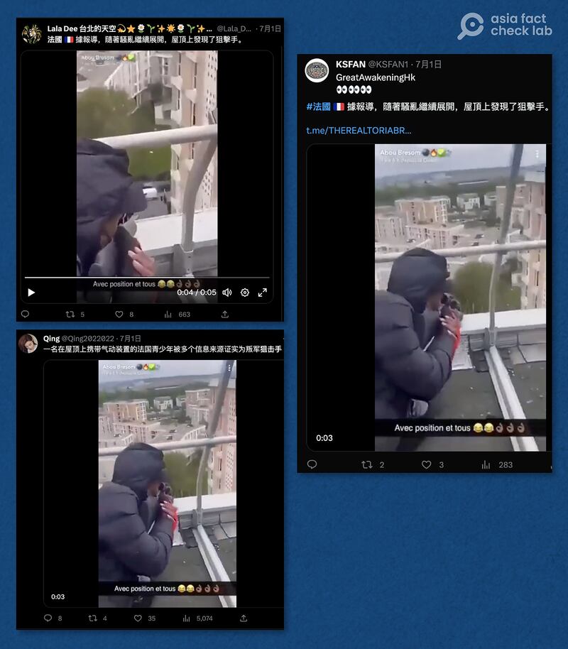 在华语社群中还有一张照片广泛流传:一名身穿黑色羽绒外套的年轻人手持无法判断真伪的狙击枪,从高楼向下瞄准。一些推特帐号将这张照片的描述为“法国骚乱中的青少年狙击手”。